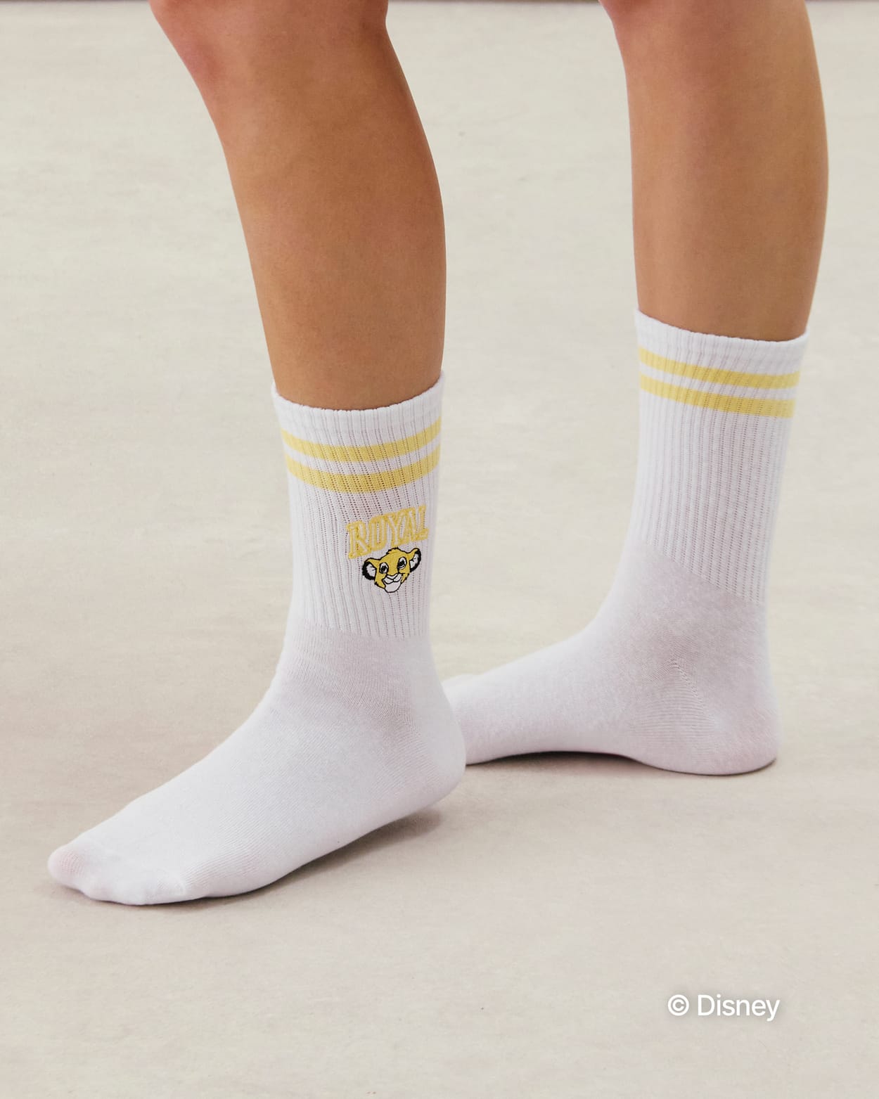 Craquez pour ces chaussettes à l'effigie de Simba ! Ces chaussettes mi-hautes en coton blanc cassé ajoutent une tou...