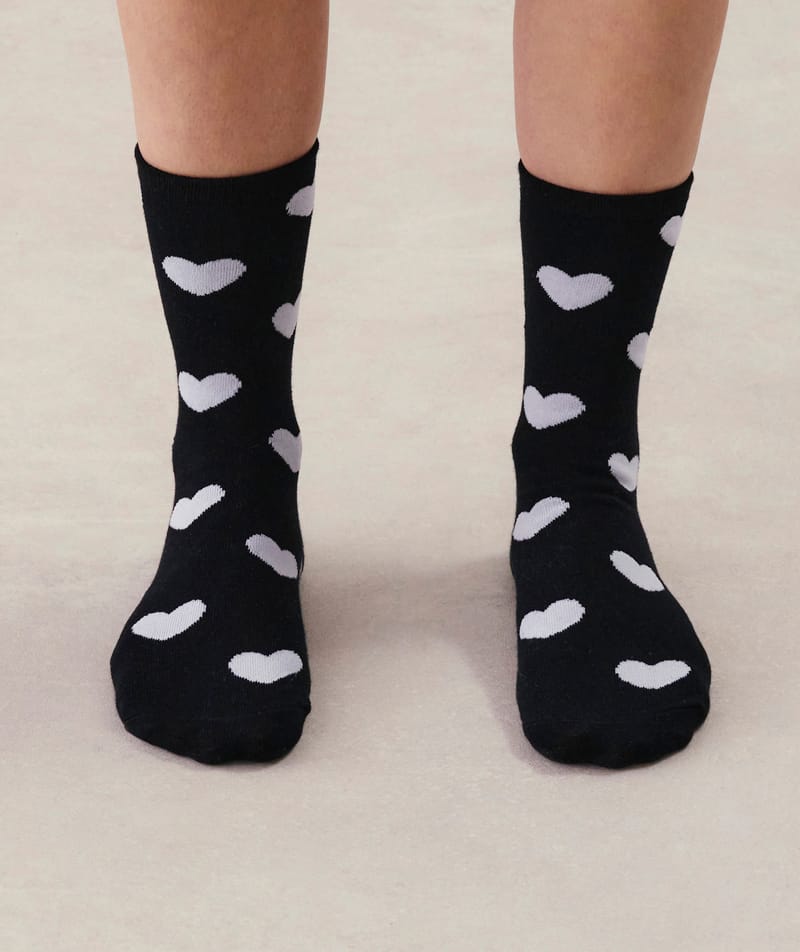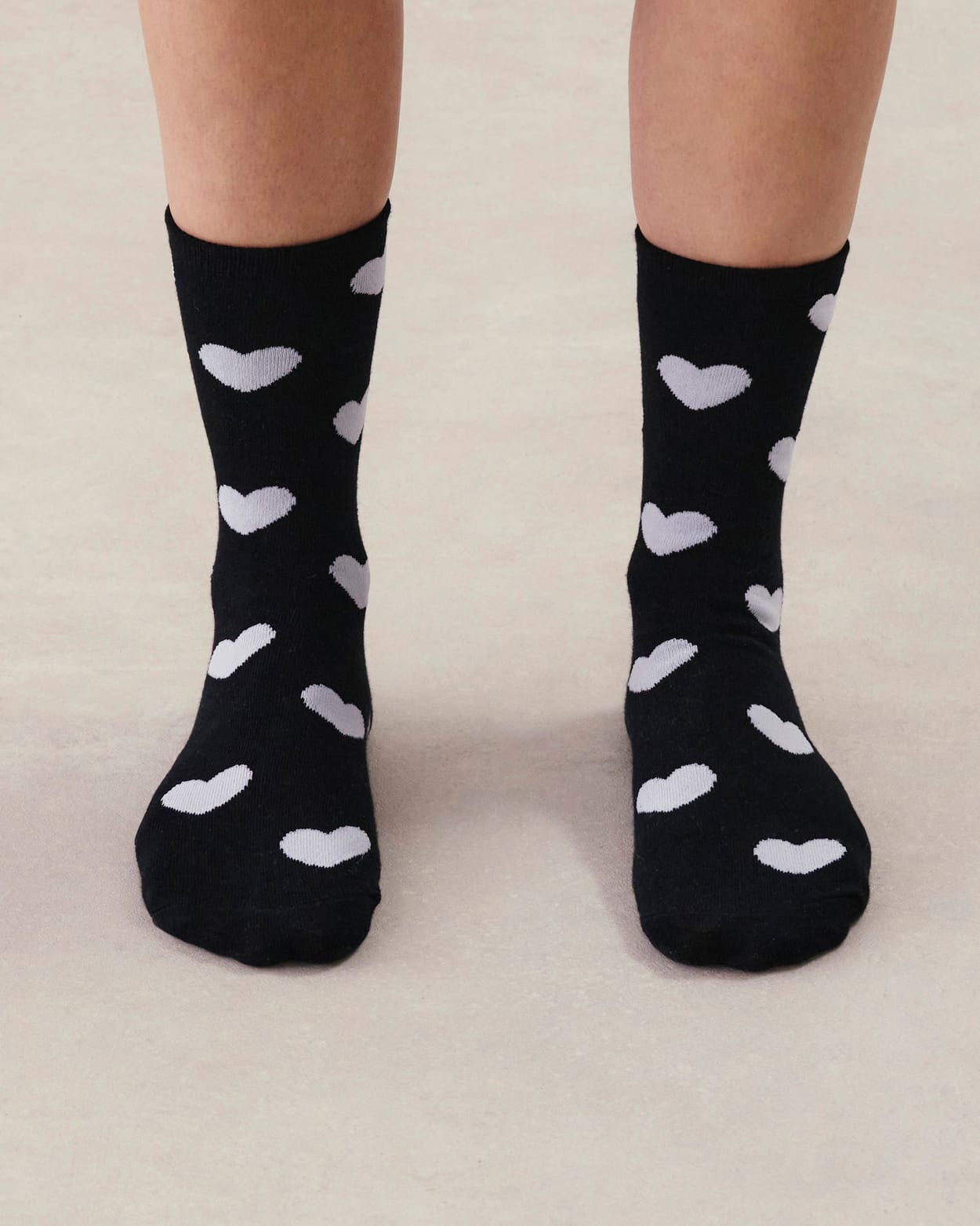 Laat je verleiden door de katoenen sokken BLACORIZ! We zijn dol op het patroon met witte hartjes op een zwarte achtergro...